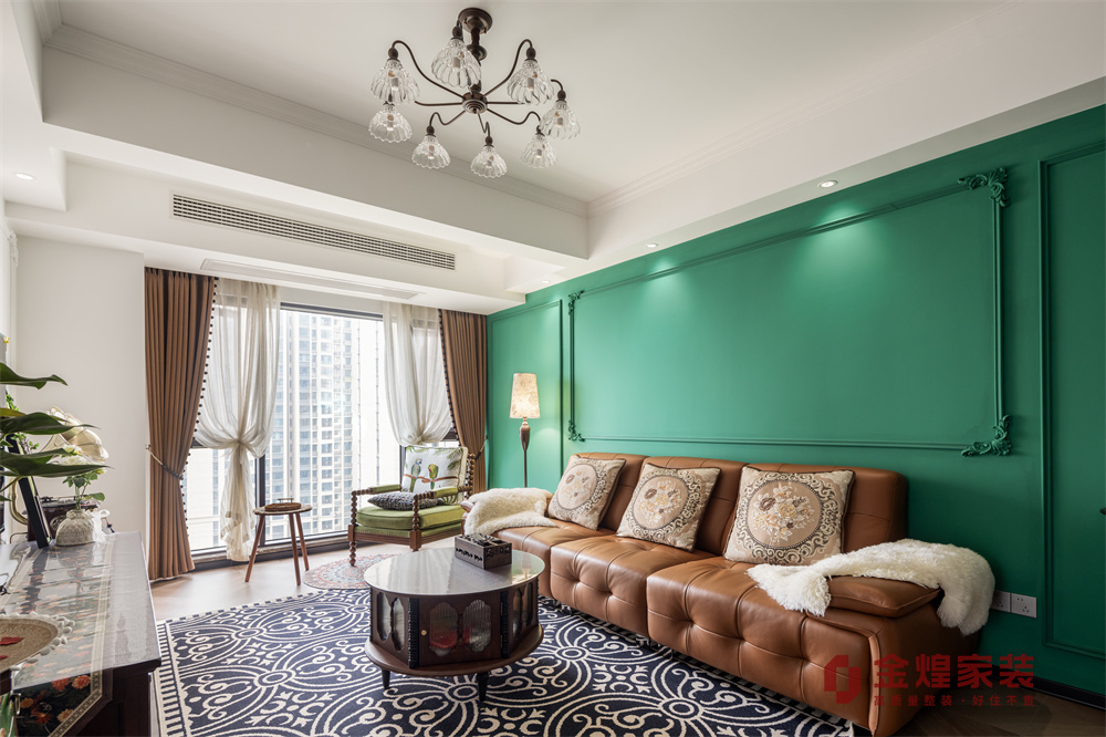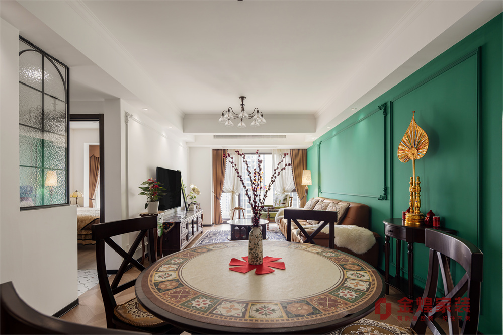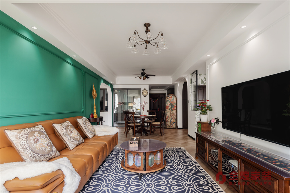 本案例拋棄傳統(tǒng)居家設(shè)計(jì)理念,設(shè)計(jì)風(fēng)格為南洋復(fù)古風(fēng)格,客廳做了一個(gè)開放式鋼琴房,餐廚區(qū)域做了一個(gè)整的7字形的櫥柜使空間最大化.