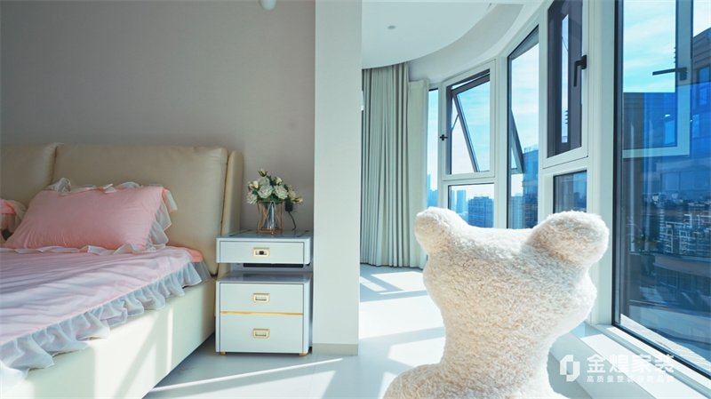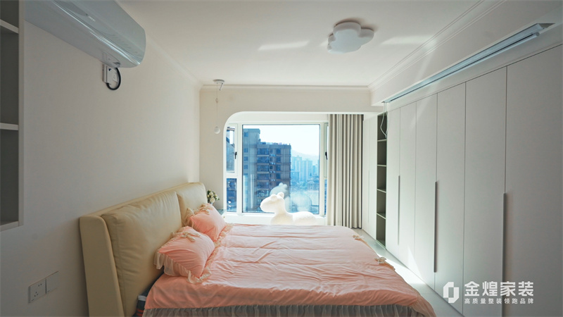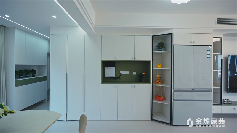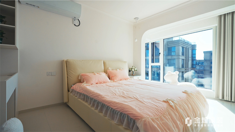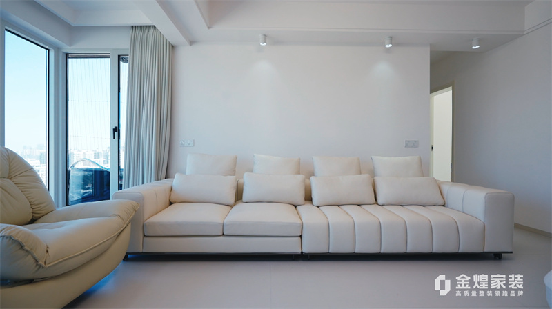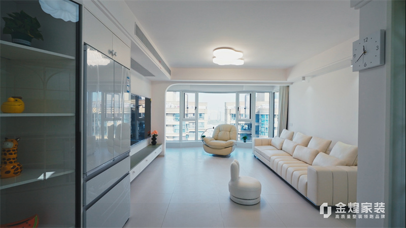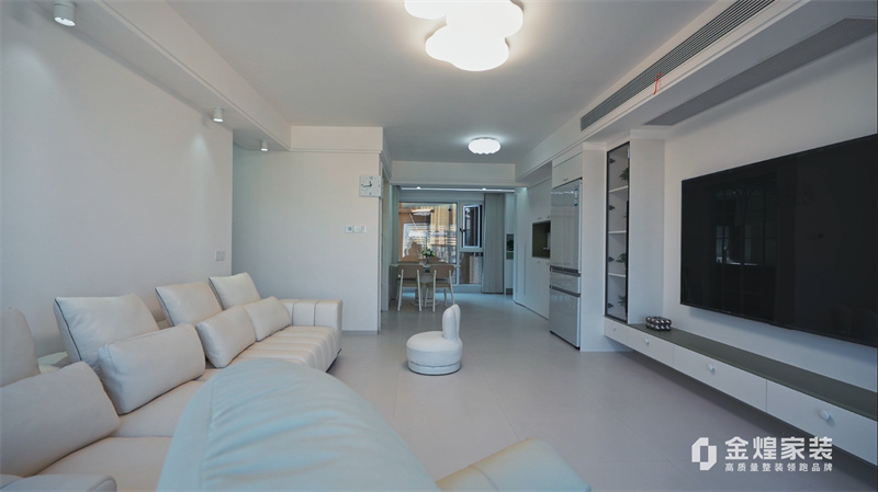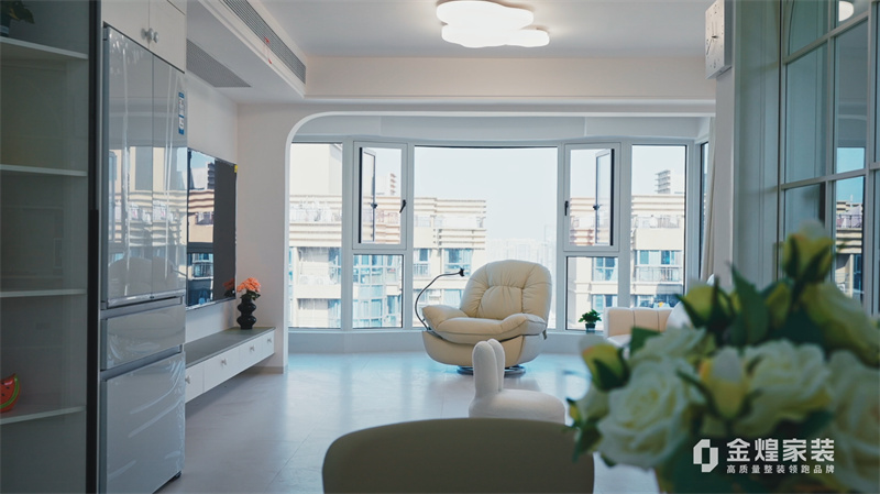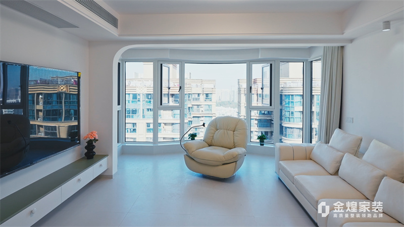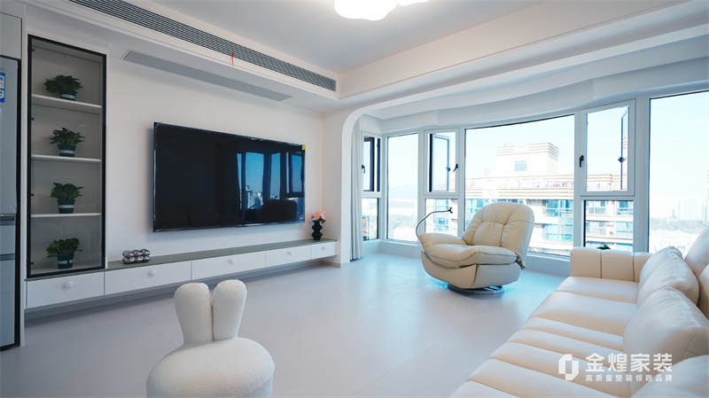 客廳內,大電視直接掛在墻上,下方配以簡約的電視柜,旁邊擺放著舒適的沙發(fā)和別致的休閑椅,沒有過多的繁雜裝飾,顯得寬敞又明亮。大窗戶的設計讓室內光線充足,進一步增強了空間的通透感。