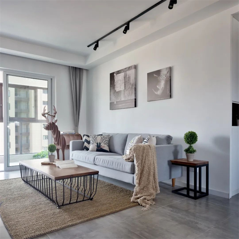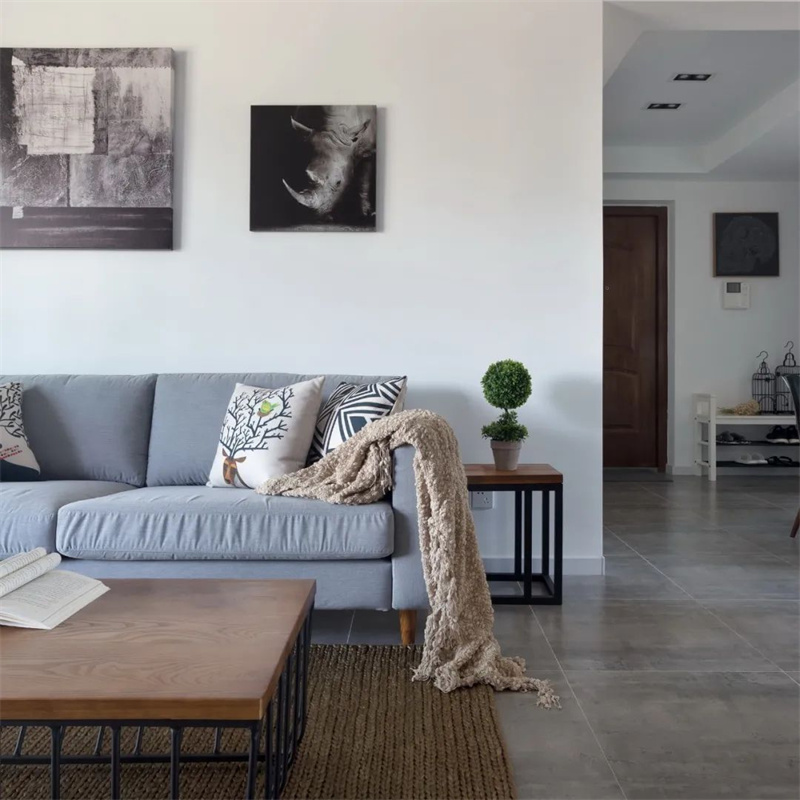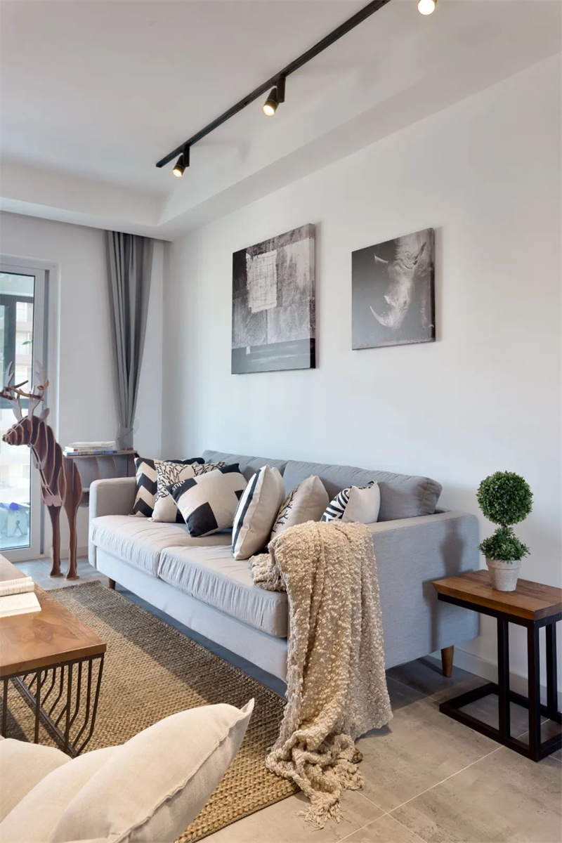 客廳整體采用了白色墻壁,使整個空間更加明亮和開放。灰色地磚增加了室內(nèi)的深度和溫暖感。家具采用原木色,強調(diào)自然元素。舒適的灰色沙發(fā)和裝飾枕頭為客廳增添了溫馨感。墻上的裝飾物和藝術品展示著北歐設計的獨特元素,為空間增添了個性。
