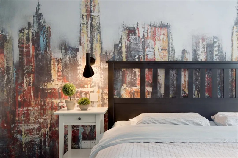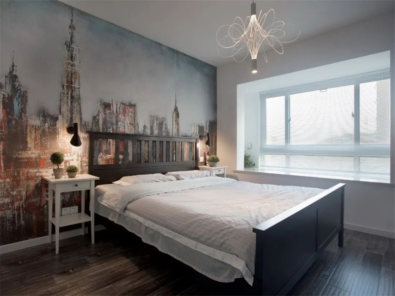 主臥室以白色墻面為主,床頭背景墻繪制大幅藝術畫,為空間增添藝術氣息。大窗戶帶來了足夠的自然光線,使臥室更加明亮。簡約的原木床加上深色地板與白色飄窗臺,簡簡單單的空間,充滿了輕松與自然的質(zhì)感。