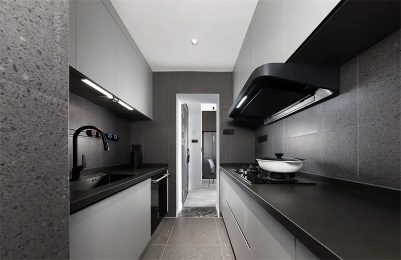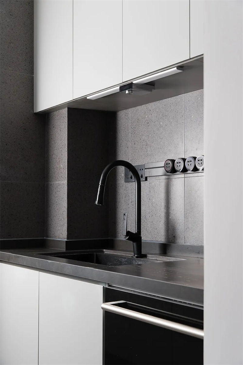 廚房是一個完美的結(jié)合了功能性和美學(xué)的空間。清潔的線條和簡約的設(shè)計元素在這里主導(dǎo),灰色的定制櫥柜提供了充足的儲存空間,同時保持了整個空間的干凈度。智能燈光和智能廚房電器的使用,提高了生活的便利性,為業(yè)主打造一個理想的烹飪空間。