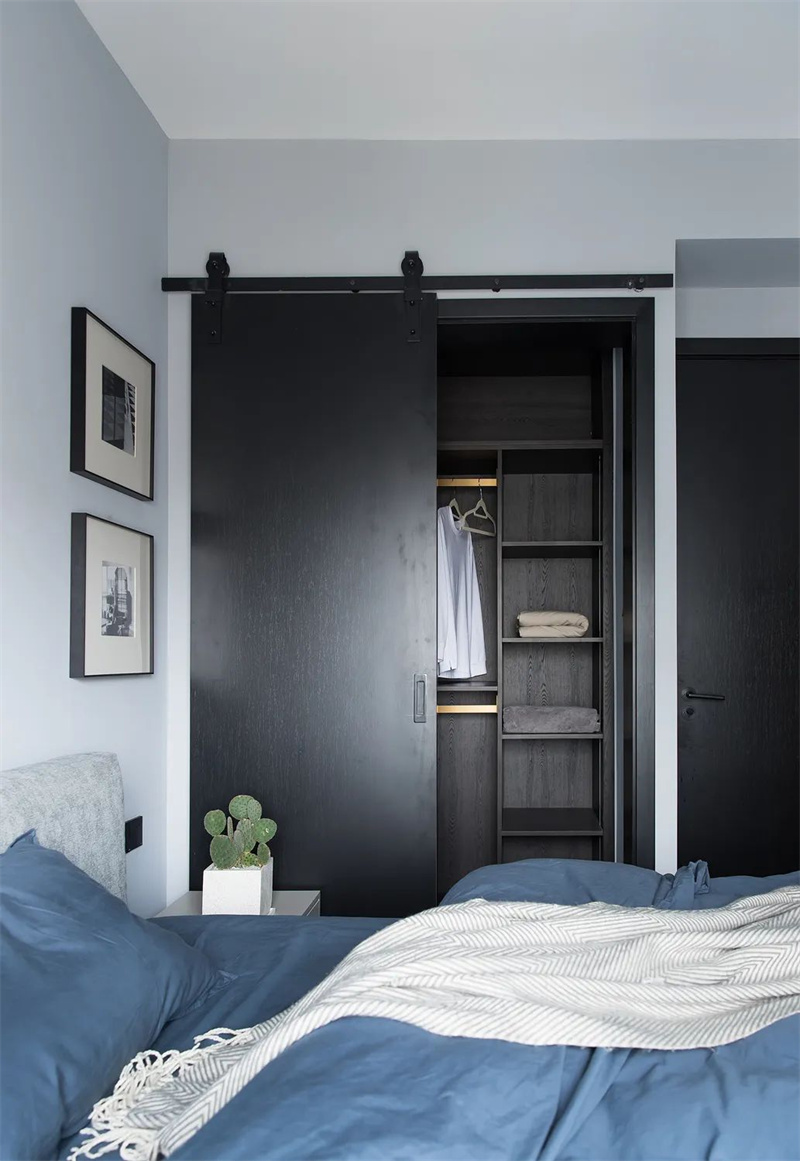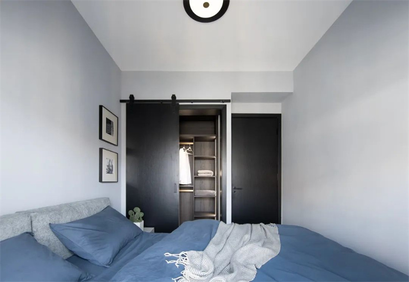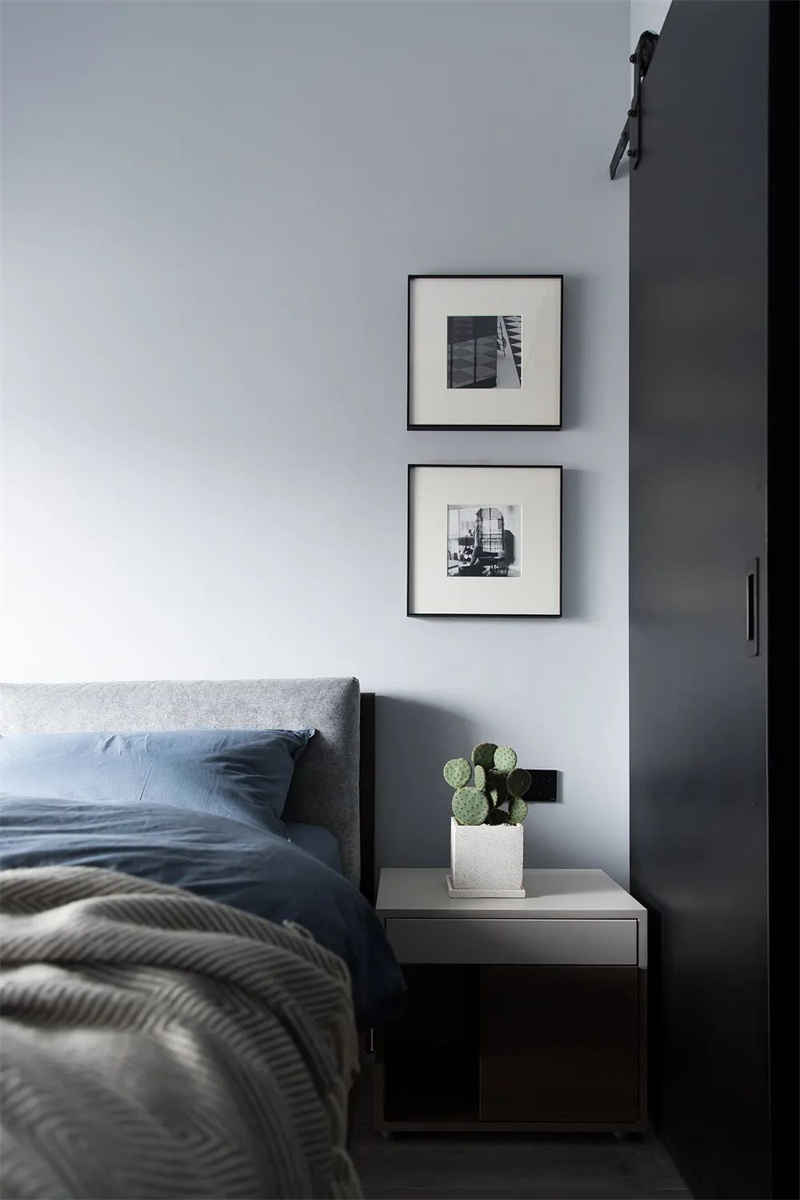 主臥室延續(xù)了整體的極簡風(fēng)格,以淺灰色和白色的搭配為主,消除了多余的裝飾元素。深色的定制柜和藍(lán)灰色的床品為臥室注入了寧靜的舒適感。通過精心設(shè)計的照明,臥室的空間質(zhì)感和氛圍得以突顯,使簡潔的設(shè)計與窗外的自然景色相得益彰。