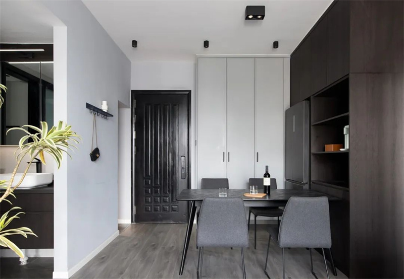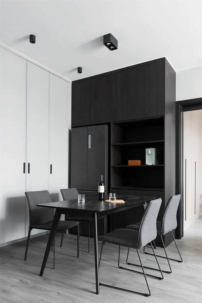 餐廳延續(xù)了整體的簡約優(yōu)雅設(shè)計風(fēng)格,以黑色大理石臺面的餐桌為中心,配以灰色布藝餐椅。旁邊的餐邊柜和嵌入式冰箱完美融合,使整個空間顯得清新、簡約和寬敞舒適。
