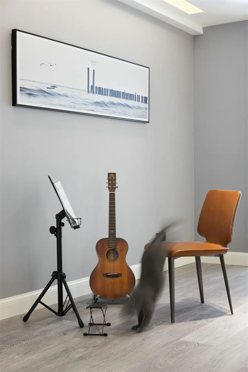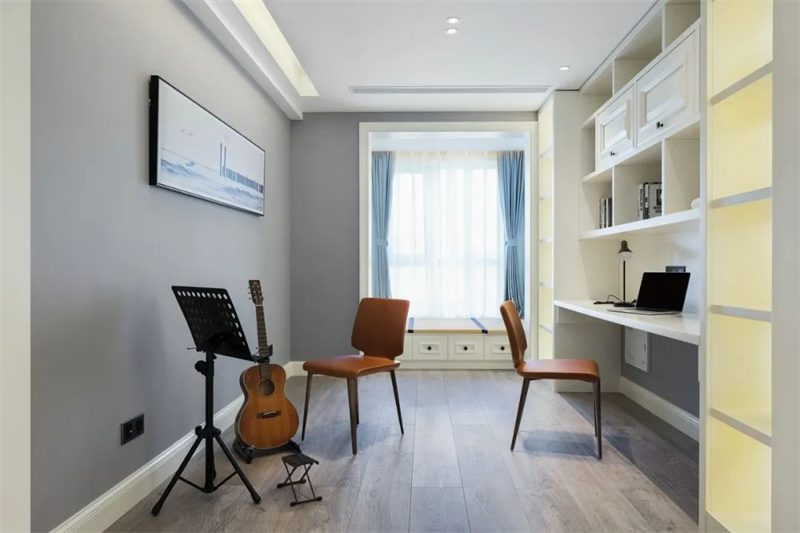 現(xiàn)代簡(jiǎn)約的書房注重實(shí)用性和整體協(xié)調(diào)性。純白書桌和書架組合,打造出一個(gè)明快而整潔的學(xué)習(xí)空間。舒適的椅子、明亮的臺(tái)燈以及一些簡(jiǎn)約的掛畫與樂(lè)器裝飾,讓這個(gè)空間兼具工作與休閑的功能。
