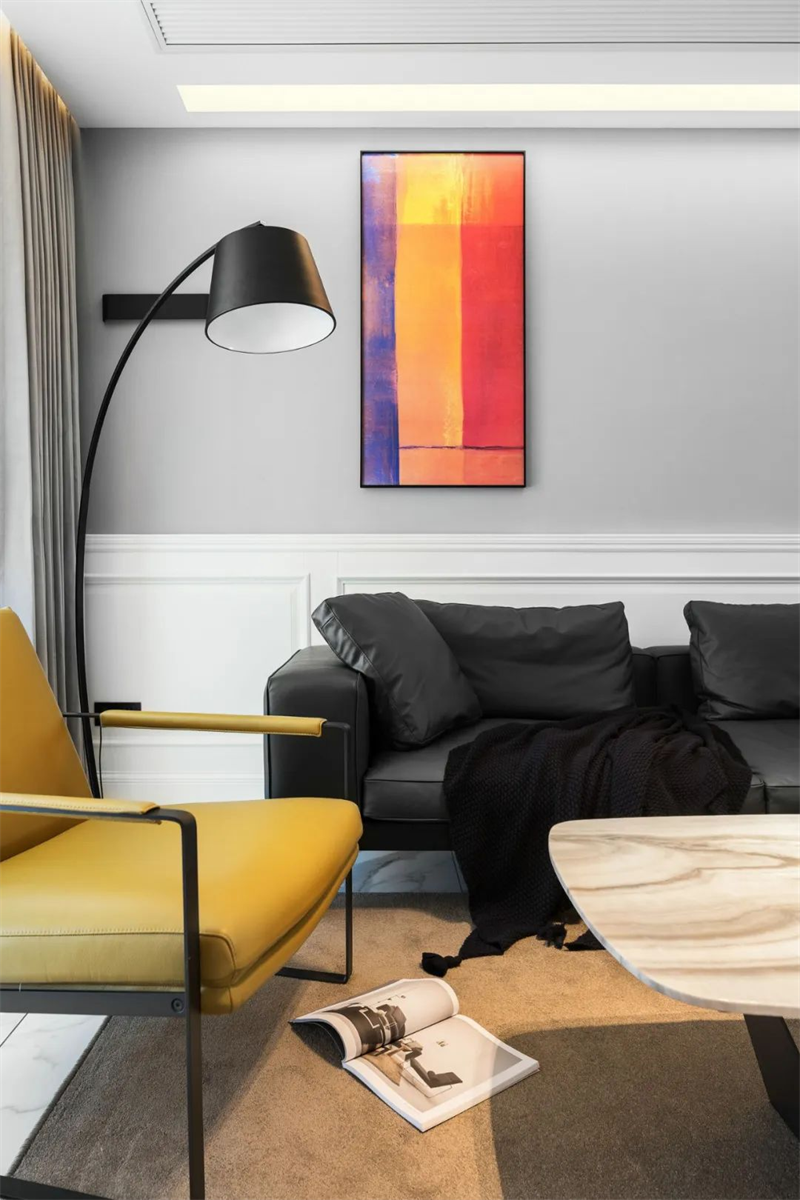 客廳主色調(diào)采用灰白墻面與白色大理石地磚搭配,創(chuàng)造出通透明亮的空間感。低調(diào)的深色調(diào)沙發(fā)展現(xiàn)簡(jiǎn)約品味。通過(guò)一些精致的極簡(jiǎn)設(shè)計(jì)裝飾畫和空間擺件,為整個(gè)客廳注入一絲藝術(shù)氛圍。