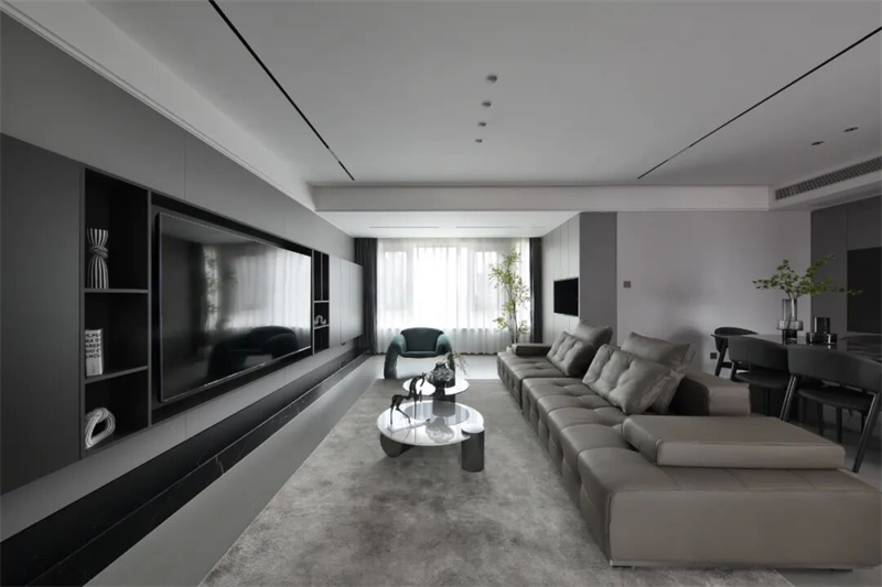 客廳以現(xiàn)代極簡風(fēng)格為基調(diào),整體采用灰黑配色,營造出沉穩(wěn)內(nèi)斂的空間氣質(zhì)。電視背景墻采用整面定制柜體設(shè)計,深灰色啞光面板與開放式格架結(jié)合,嵌入式電視隱藏其中,視覺整潔統(tǒng)一。底部黑色大理石基座提升層次感,兼具裝飾與收納功能。