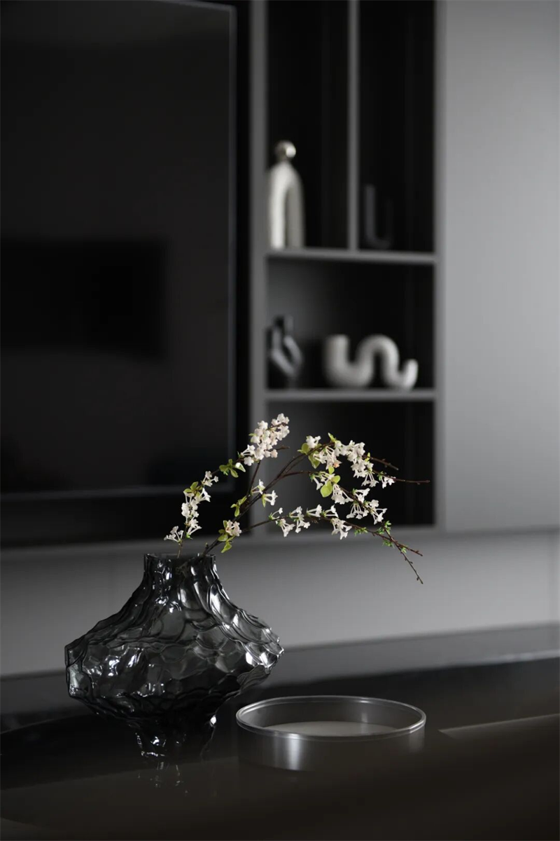 餐廳整體色調(diào)統(tǒng)一,以灰白為主,營造出沉靜而高級的用餐氛圍。黑色大理石餐桌質(zhì)感細膩,搭配深色皮質(zhì)餐椅,線條簡潔流暢,坐感舒適且富有設(shè)計感。桌面上擺放透明花瓶與綠植,為冷調(diào)空間增添一抹自然生機。