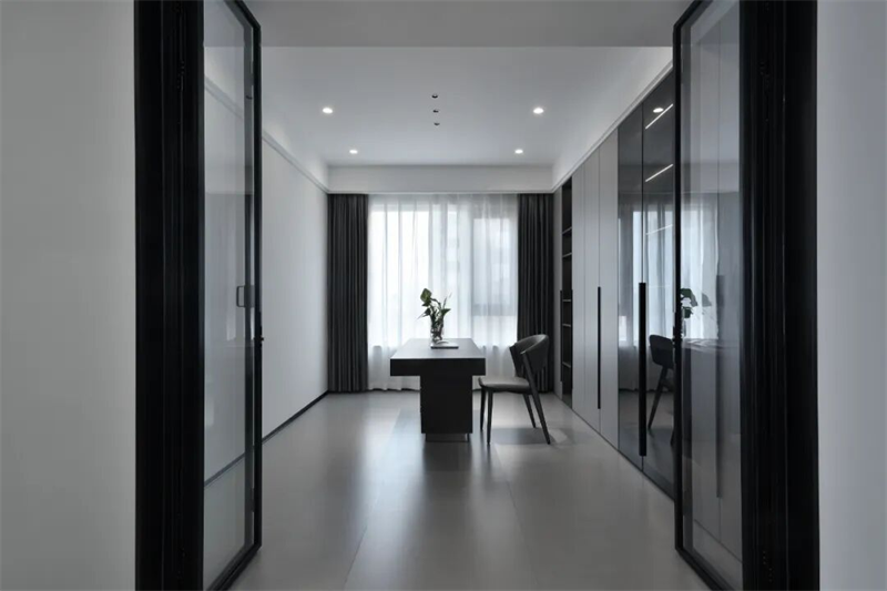 書房空間通透寧靜,以灰白為主調(diào)。黑色金屬框玻璃門隔斷,既保證私密性,又不影響采光與視線通透。室內(nèi)地面鋪設(shè)灰色啞光地磚,墻面簡潔無飾,突出空間的純粹感。整體布局簡潔有序,摒棄多余裝飾,打造一個安靜、高效、富有質(zhì)感的獨立思考與工作空間,讓思緒在靜謐中自由流淌。