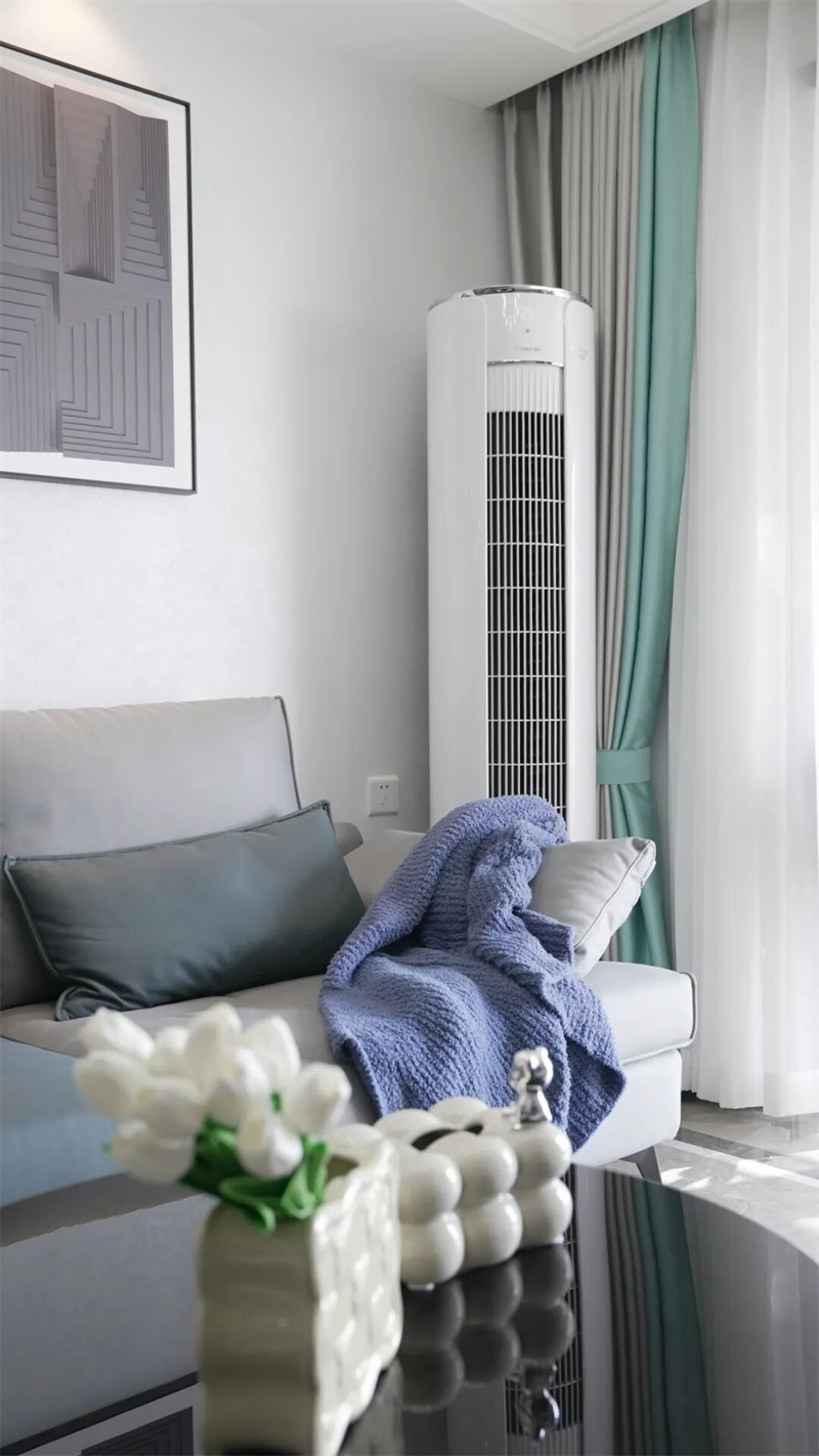 地面通鋪灰色亮面瓷磚,搭配金屬邊框地磚拼接線(xiàn),增強(qiáng)空間縱深感。大面積窗戶(hù)引入自然光,搭配淺色紗簾與青綠色窗簾,讓室內(nèi)明亮通透又不失私密??蛷d與餐廳開(kāi)放式連接,動(dòng)線(xiàn)流暢,視野開(kāi)闊,真正實(shí)現(xiàn)了“家”的開(kāi)放與包容——在這里,生活既精致又自在。