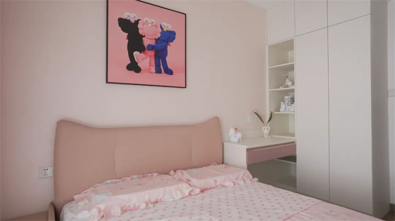 兒童房以柔和的粉色為主調(diào),營(yíng)造溫馨可愛(ài)的氛圍。床頭軟包與床品呼應(yīng),搭配卡通圖案,充滿(mǎn)童趣。墻上掛有時(shí)尚藝術(shù)畫(huà)作,增添個(gè)性與趣味。右側(cè)定制衣柜與書(shū)桌一體設(shè)計(jì),收納與學(xué)習(xí)功能兼?zhèn)?,?jiǎn)潔實(shí)用。窗簾采用粉灰拼色,透光柔和,整體空間既夢(mèng)幻又不失現(xiàn)代感,是孩子成長(zhǎng)的理想小天地。