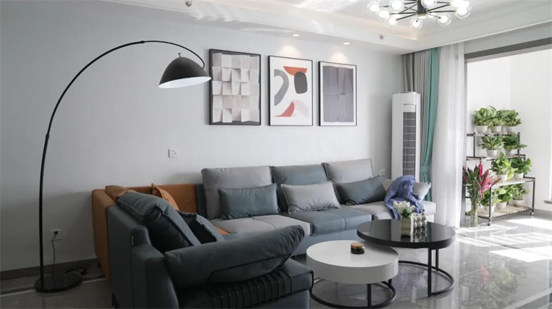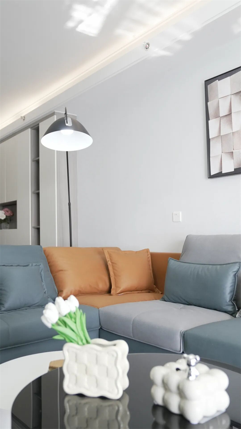 客廳L型布藝沙發(fā)選用藍(lán)灰與橙色拼接配色,既提升視覺(jué)活力,又帶來(lái)柔軟舒適的坐感體驗(yàn)。中央圓形茶幾組合簡(jiǎn)潔實(shí)用,黑白搭配呼應(yīng)整體色調(diào)。墻上三幅抽象藝術(shù)掛畫(huà)點(diǎn)綴墻面,增添藝術(shù)氣息。一盞黑色弧形落地?zé)舨粌H提供局部照明,更成為空間中的點(diǎn)睛之筆。