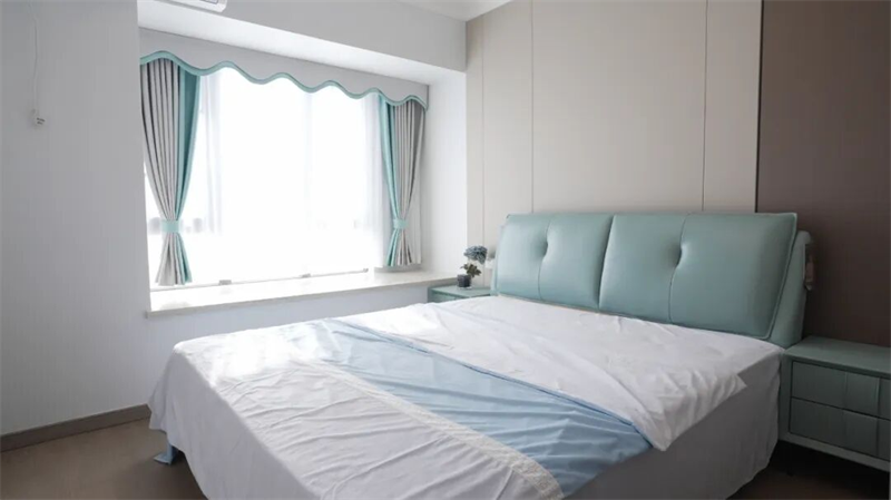 主臥以柔和色調(diào)營(yíng)造寧?kù)o舒適的睡眠空間,淺灰與木色背景墻搭配湖綠色軟包床頭,清新雅致。同色系床頭柜與衣柜設(shè)計(jì)協(xié)調(diào)統(tǒng)一,簡(jiǎn)潔實(shí)用。大窗配淺色紗簾與波浪邊窗簾,采光充足又不失溫馨。整體布局清爽有序,讓臥室成為放松身心的理想休憩之所。