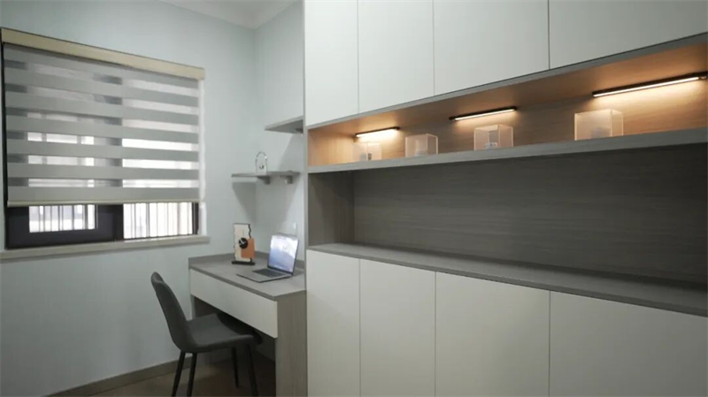 書(shū)房以簡(jiǎn)潔實(shí)用為主,淺藍(lán)墻面搭配木紋與白色柜體,營(yíng)造安靜專(zhuān)注的氛圍。一張簡(jiǎn)約書(shū)桌,搭配舒適座椅,光線(xiàn)充足,適合閱讀與辦公。上方定制儲(chǔ)物柜結(jié)合開(kāi)放格與隱藏?zé)魩?,既提升收納能力,又增添空間層次感。