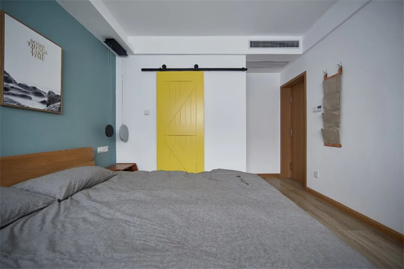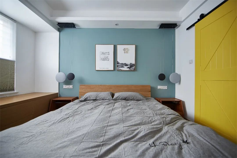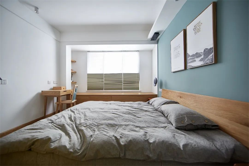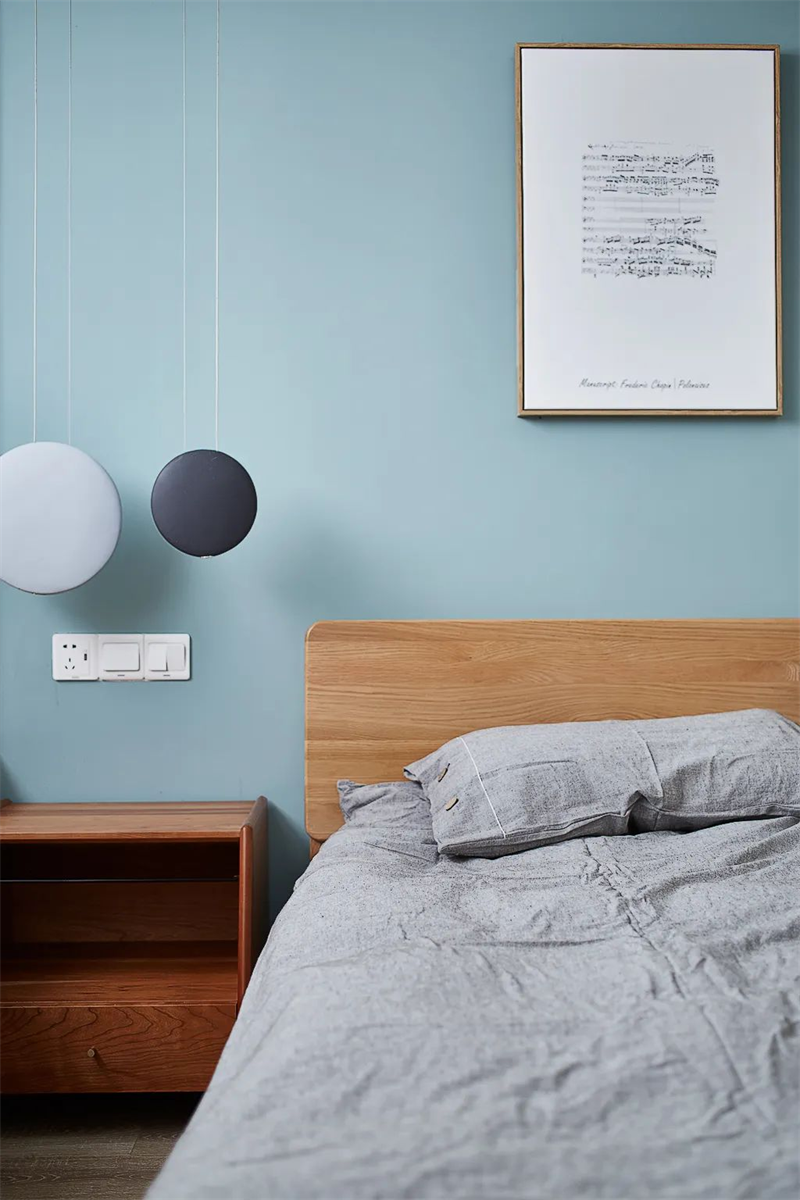 主臥室墻面是明亮的白色,藍(lán)色的床頭背景與灰色的床品組合,加上原木地板和實(shí)木家具,給空間帶來清新的自然感。主臥室的照明設(shè)計(jì)考慮到了夜間舒適的用光需求,包括床頭臺(tái)燈和壁燈,打造完美的休憩空間。