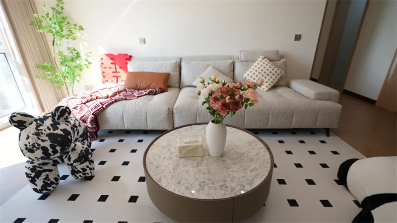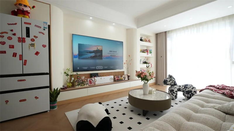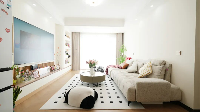 客廳里,米白沙發(fā)搭配幾何地毯,點(diǎn)綴一抹紅喜字與熊貓玩偶,傳統(tǒng)與童趣悄然融合,讓家在簡(jiǎn)約中透出滿滿溫度與個(gè)性。這不僅是一次裝修,更是一種松弛而有愛的生活方式的開啟。