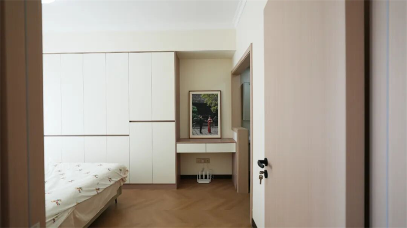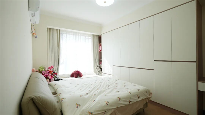 主臥以極簡(jiǎn)線條勾勒出寧?kù)o的休憩空間,延續(xù)原木奶油風(fēng)的溫柔基調(diào),營(yíng)造出如云朵般輕盈的睡眠氛圍。通頂式奶油白衣柜搭配淺木色邊框,簡(jiǎn)約而不失設(shè)計(jì)感,巧妙隱藏收納,讓空間整潔有序。床品選用清新印花圖案,點(diǎn)綴一抹童趣與生機(jī),與窗邊一束鮮花相映成趣,喚醒生活的詩(shī)意。