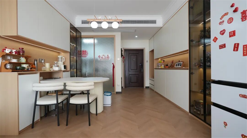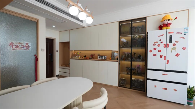 原木奶油風(fēng)的基調(diào)延續(xù)至餐廚區(qū)域,開放式餐邊柜設(shè)計(jì)巧妙融合收納與展示功能,暖光燈帶點(diǎn)亮每一處細(xì)節(jié),讓日常用品也擁有詩(shī)意的陳列。圓潤(rùn)的白色餐桌搭配柔軟坐墊椅,營(yíng)造輕松圍坐的溫馨氛圍;一旁冰箱貼滿喜慶紅標(biāo)與可愛貼紙,洋溢著新居的喜悅與煙火氣。