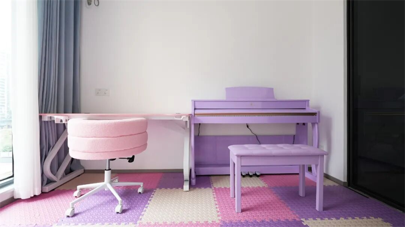 書房整體以柔和的粉紫系為主調(diào),一整面落地窗引入充足自然光,搭配灰藍(lán)色窗簾,既保證采光又調(diào)節(jié)光線柔和度,為專注學(xué)習(xí)提供舒適環(huán)境。房間中央擺放著一架淡紫色電鋼琴,配同色系琴凳,優(yōu)雅中透著可愛,激發(fā)孩子對音樂的熱愛;一側(cè)是可升降書桌,搭配柔軟粉色毛絨椅,科學(xué)護(hù)眼又兼顧舒適,滿足書寫、閱讀與作業(yè)需求。