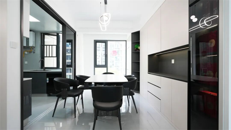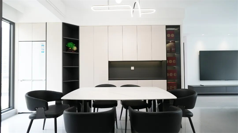 餐廳延續(xù)整體現(xiàn)代簡約的基調(diào),一張大尺寸巖板餐桌搭配六把黑色皮質(zhì)餐椅,線條利落、質(zhì)感高級,既滿足家庭聚餐需求,也兼顧日常生活的儀式感。背景墻定制整面儲物柜,白色柜門與深色開放式格架形成視覺對比,兼具收納與展示功能。靠窗布局讓自然光充分灑落,提升用餐時的通透感與舒適度。