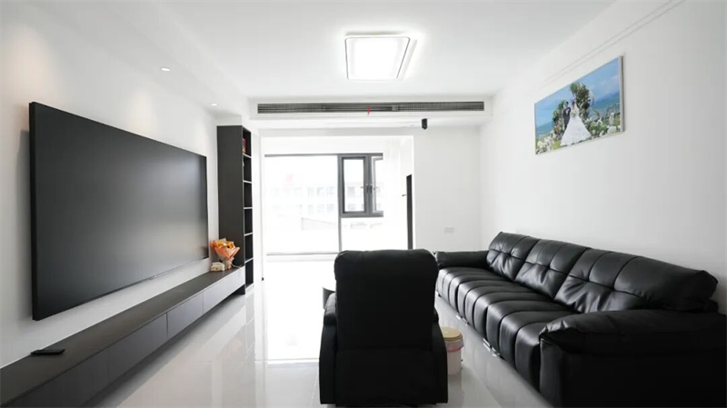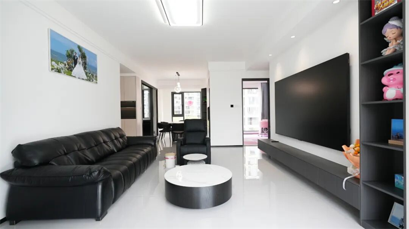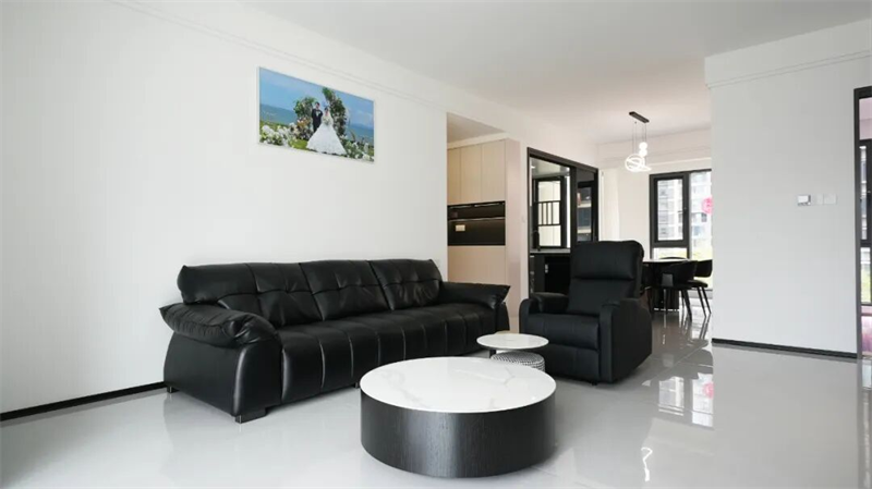 黑色皮質(zhì)沙發(fā)線條流暢,質(zhì)感高級,搭配圓形大理石茶幾與格紋邊幾,形成現(xiàn)代而舒適的會客區(qū)。通透落地窗將自然光引入室內(nèi),高光地磚映照出明亮通達(dá)的空間氛圍,讓每一寸光線都成為生活的注腳。墻上一幅婚紗照靜靜訴說著家的歸屬與情感記憶,而遠(yuǎn)處陽臺的“囍”字貼紙,則為這份理性之美添上一抹溫情的儀式感。