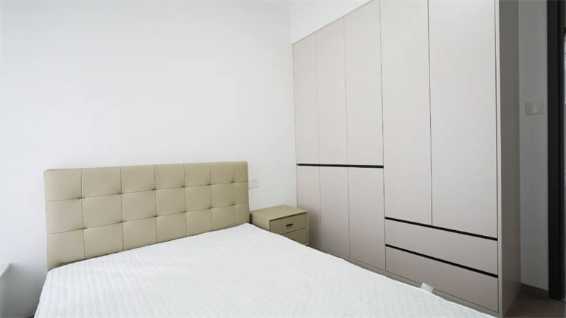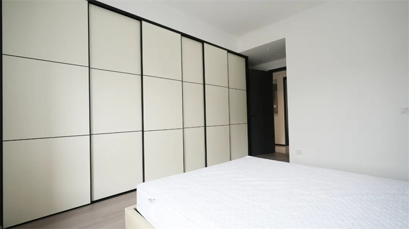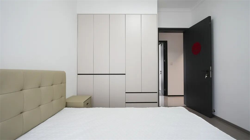 次臥延續(xù)整體現(xiàn)代簡約風(fēng)格,以克制的色彩與利落的線條營造出安靜、整潔的休憩氛圍。整面墻定制衣柜,以淺色柜門配黑色裝飾線條,簡潔大方又不失設(shè)計感,有效提升收納能力的同時保持視覺清爽。床側(cè)小巧床頭柜實用而不占空間,滿足日常置物需求。
