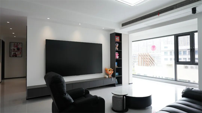客廳以極簡美學(xué)為底色,用黑白灰的純粹配比勾勒出干凈利落的空間輪廓。整面墻懸掛的超大尺寸電視,搭配懸浮式深灰色電視柜,營造出視覺上的輕盈與秩序感。一側(cè)嵌入式開放式置物架巧妙融入收納與展示功能,陳列著溫馨小物與趣味擺件,在冷靜中注入生活溫度。